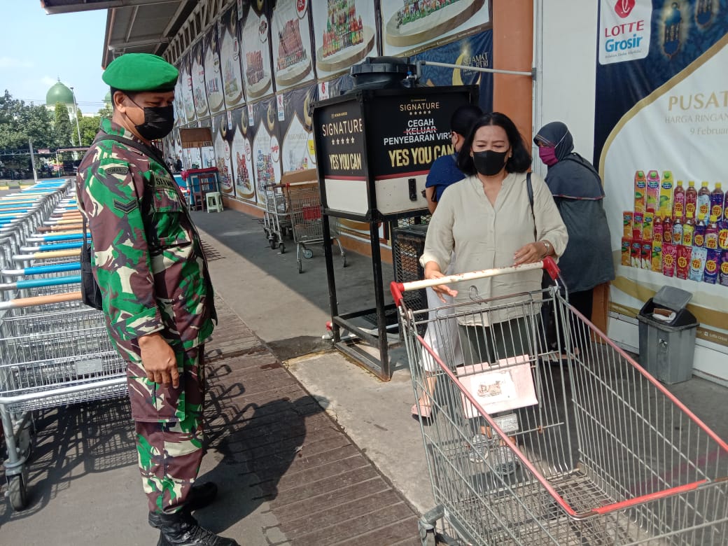 Sertu Sarmin memberikan Himbauan dan akan mengecek satu persatu para pengunjung yang akan berbelanja di Grosir Lotte Mart dan tidak henti hentinya juga disampaika himbuan kepada masyarakat untuk selalu melaksanakan protokol kesehatan seperti cuci tangan, memakai masker, jaga jarak apabila keluar rumah ataupun sedang aktifitas di tempat keramaian dan saat keluar Rumah.