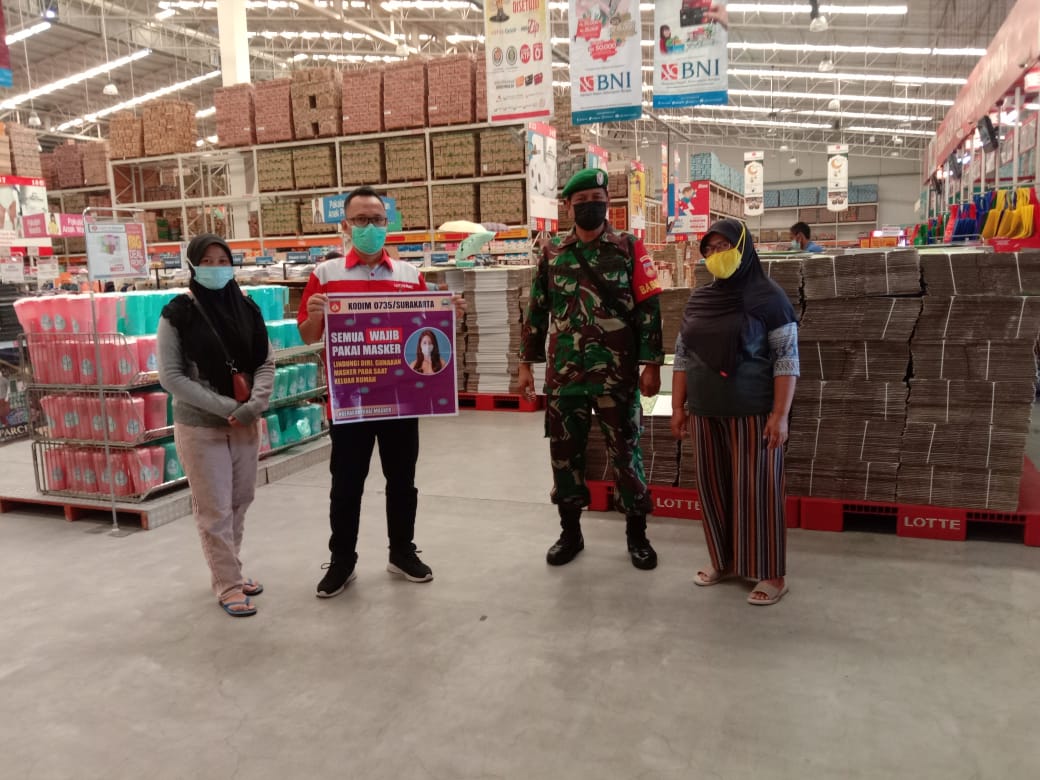 Babinsa menggandeng Staf, Karyawan,Satpam Grosir Lotte Mart akan terus menerus menghimbau para pengunjung Mall agar mengedepankan protokol kesehatan apabila Memasuki pertokoan di manapun berada dan selalu mematuhi 5 M meliputi Mencuci Tangan, Memakai Masker, Menjaga Jarak, Menjahui Kerumunan dan Mengurangi Mobilitas yang sudah di tetapkan pemerintah kota Surakarta.