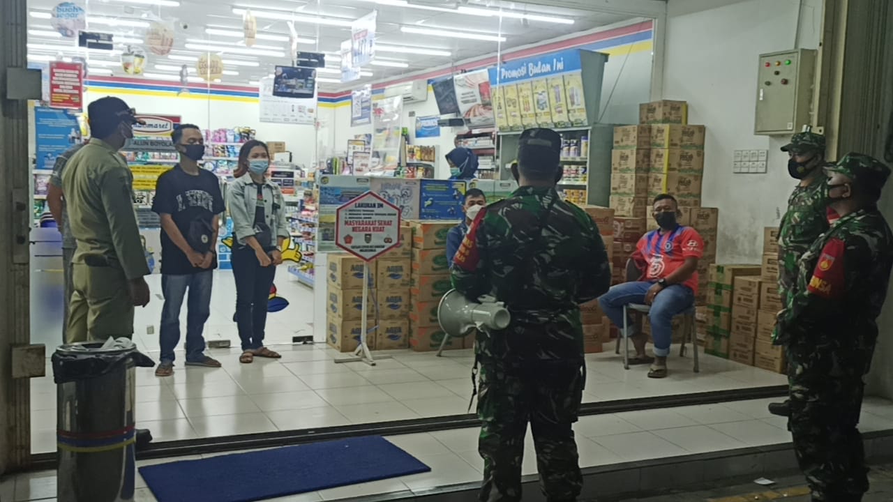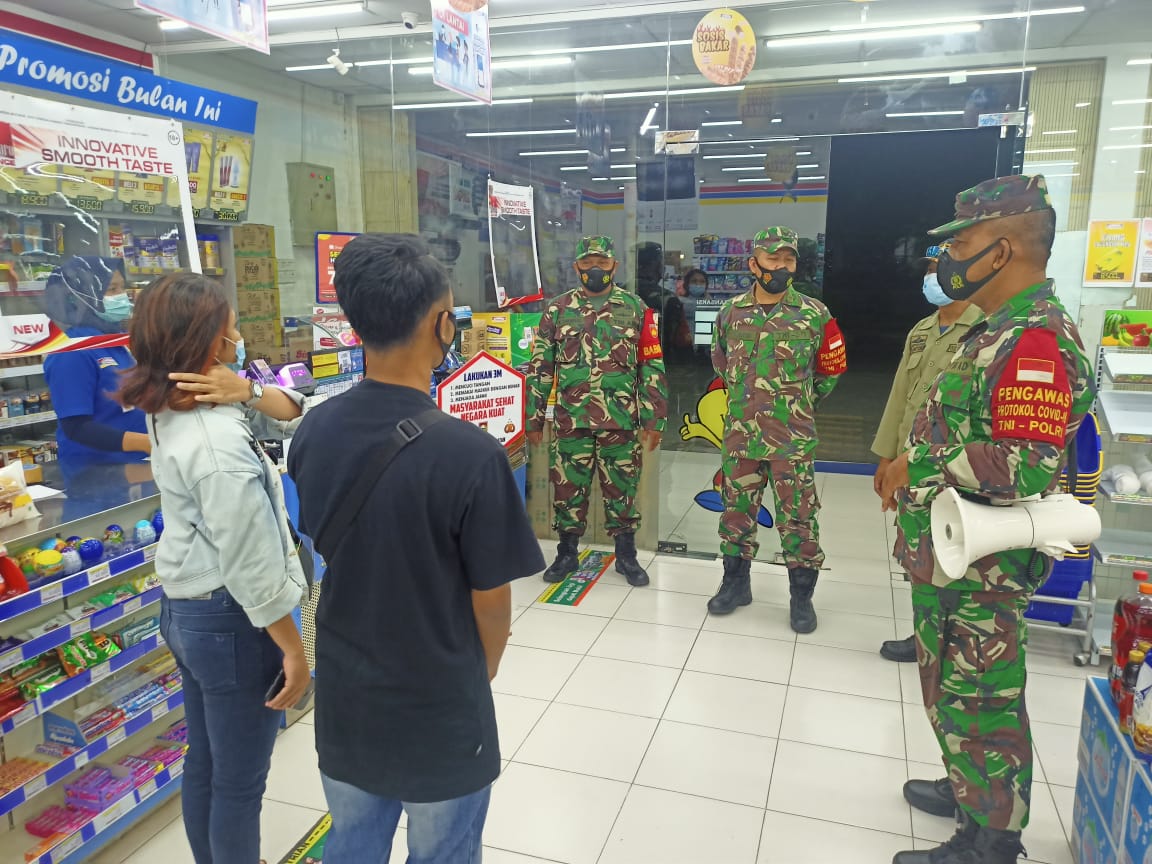 Anggota Koramil 03/Mojosongo Kodim 0724/Boyolali dan Satpol PP Kecamatan Mojosongo serta Linmas Kemiri melaksanakan patroli Yustisi penertiban Protokol kesehatan terhadap warga di lokasi Toserba di kelurahan Kemiri kecamatan Mojosongo kabupaten Boyolali .Jumat Malam ( 20/05).