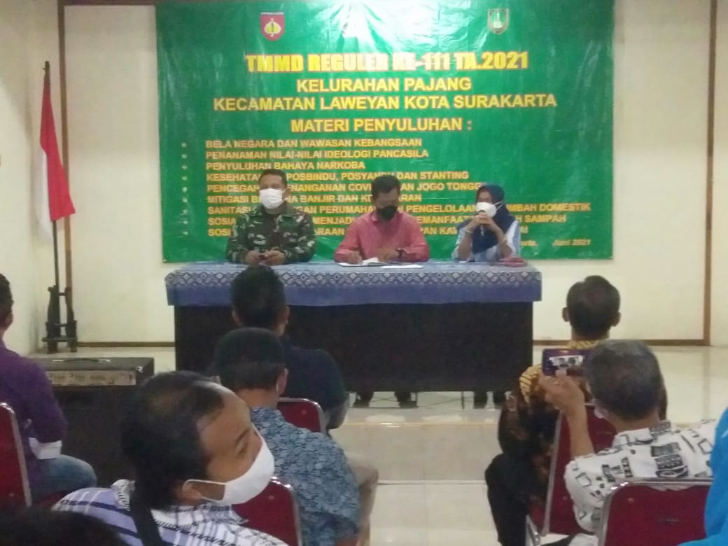 Pada Jum’at (25/06) malam, Kodim 0735/Surakarta berkesempatan memberikan materi untuk pertama kalinya dalam kegiatan non fisik. Bertempat di Aula Kelurahan Pajang, Jl. Sidomukti Utara I, No: 7 Kelurahan Pajang, Kecamatan Laweyan Kapten Cba Tri Rusman Prasetyo yang menjabat sebagai Perwira Seksi Teritorial (Pasiter) Kodim memberikan penyuluhan tentang Bela Negara dan Wawasan Kebangsaan, dalam rangka TMMD Reguler ke 111 TA.2021 Kelurahan Pajang yang dihadiri oleh 45 orang peserta.