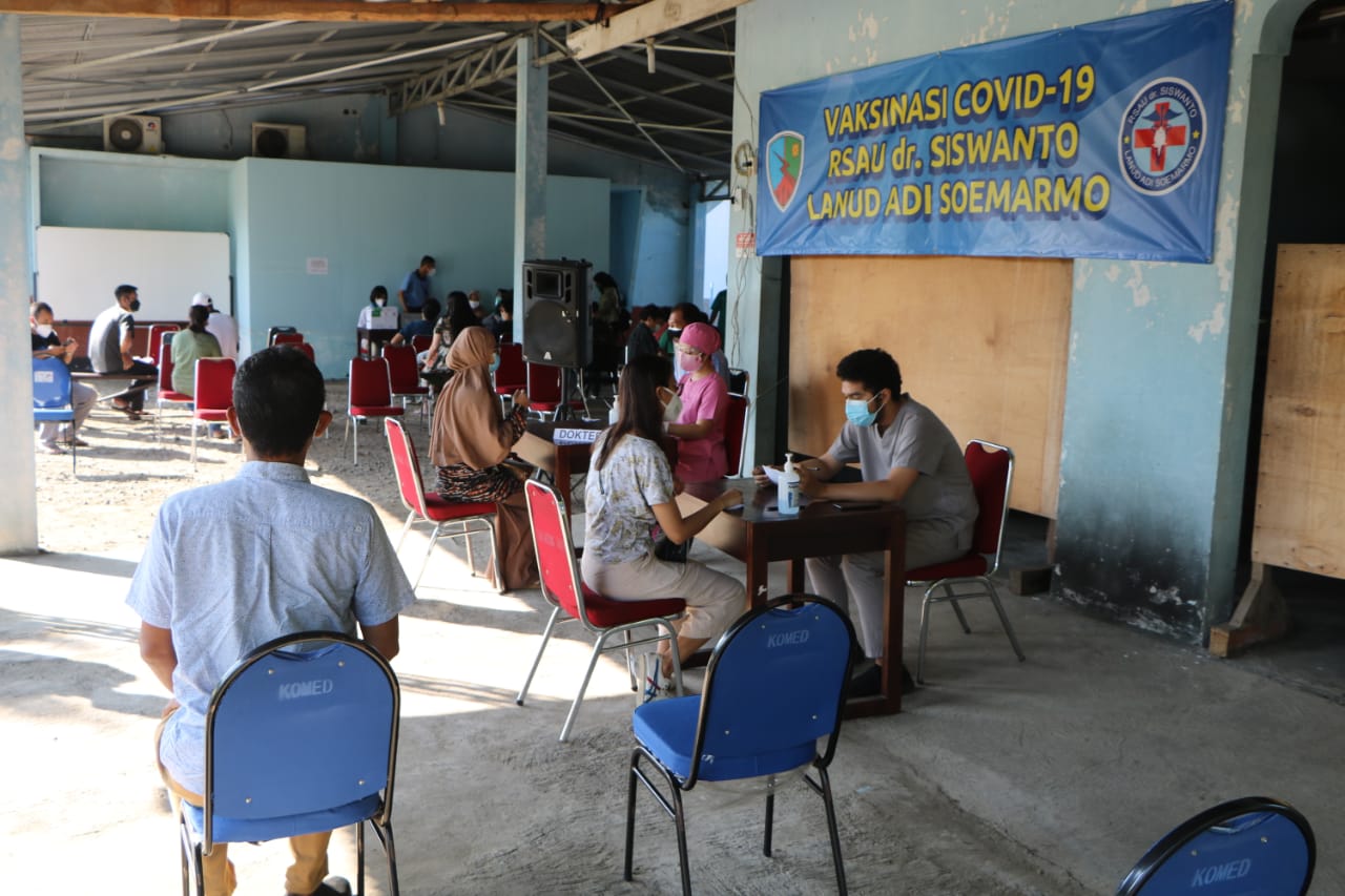 Nampak warga masyarakat mulai berdatangan di RSAU dr. Siswanto Lanud Adi Soemarmo mulai pukul 07.00 WIB, warga masyarakat cukup antusias untuk mendapatkan vaksin Covid 19 gratis, dimana dalam pelaksanaannya telah diatur oleh Binpotdirga melalui para Babinpotdirga yang telah membagikan kupon kepada masyarakat agar pelaksanaan vaksinasi dapat tertib dan menghindari penumpukan massa.