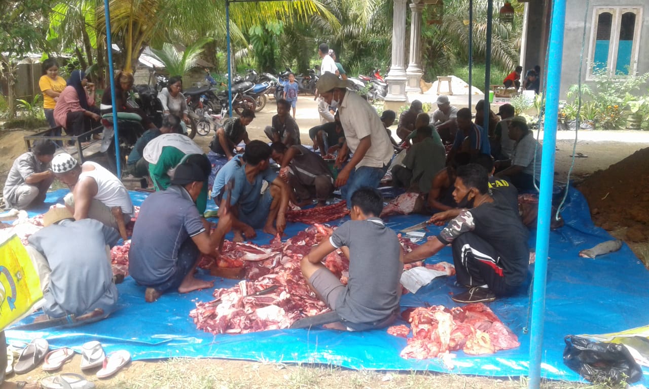 Bungonews,net, BUNGO- Dusun Dwi Karya Bakti ( DKB ) Kecamatan Pelepat Kabupaten Bungo – Jambi yang dipimpin oleh Datuk Rio (kepala desa Red ) Supriyanto menghadapi hari raya idul adha tahun ini 1442 H /2021 menyembeli 12 ekor sapi dan 9 ekor kambing yang daging nya di bagikan kepada warga yang berhak menerima