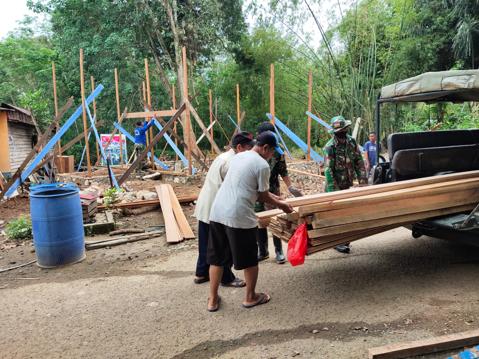 Alhamdulillah hari ini kita dapat mendistribusikan bahan bangunan seperti papan dan balok kayu ukuran 8×8 centimeter,”terang Plh. Pasiter Kodim 1002/HST Kapten Inf Moh.Alip Suroso saat melakukan pengecekan di sasaran tambahan TMMD ke-112 tahun 2021 yaitu renovasi musholla Noor Iman.Senin (13/09/2021).