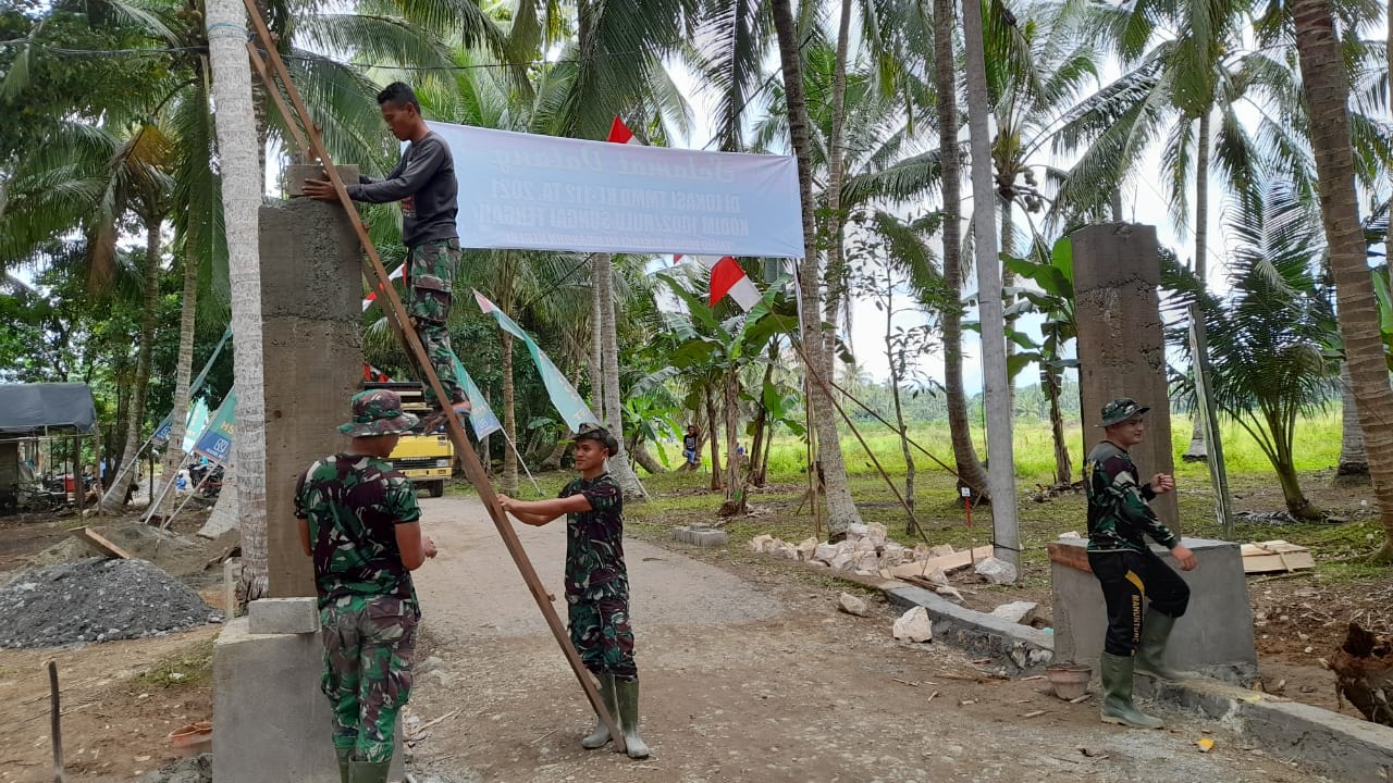 Sampai dengan hari ini, pembangunan Gapura TMMD sudah mencapai 45 persen dan pengecoran tiang gapura berjalan dengan lancar. Minggu (19/09/21) pagi waktu setempat