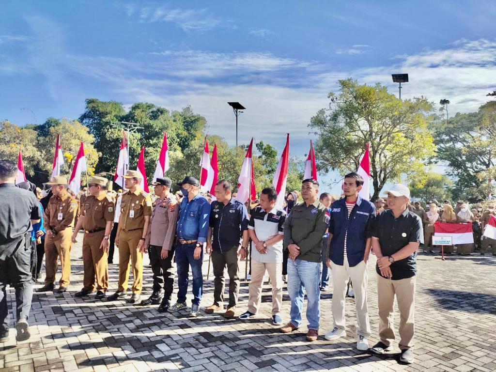 bersama Wakil Walikota Alvia Santoni, Forkopimda dan Sekda Alpian usai apel kerja Pemkot Sungai Penuh,telah melounching gerakan pembagian 10 juta bendera merah putih tersebut dilapangan Kantor Walikota Sungai Penuh