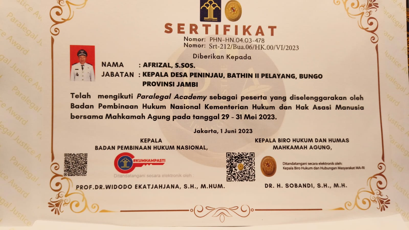 Afrizal, S.Sos satu – satunya kepala desa dalam kabupaten Bungo yang ikut audisi kandidat PJA 2023 mendapat 1 gelar dan 2 Penghargaan dari kemenkumham