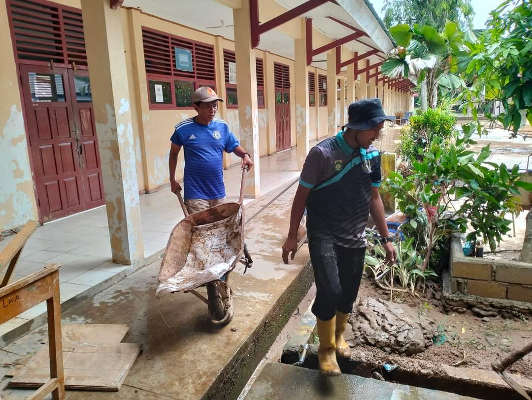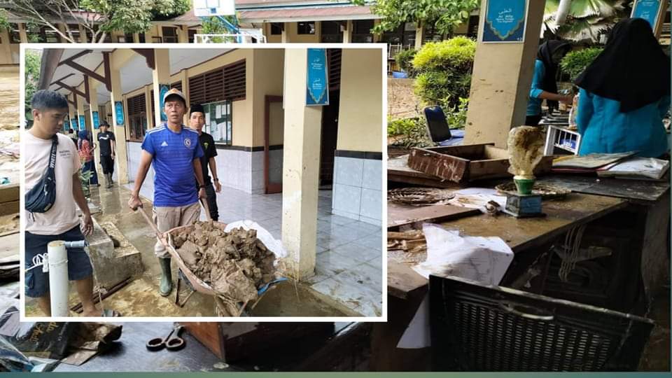 ” Kami sedang membersihkan sekolah pasca banjir kemaren bang ” ujar Tri Qurniawan