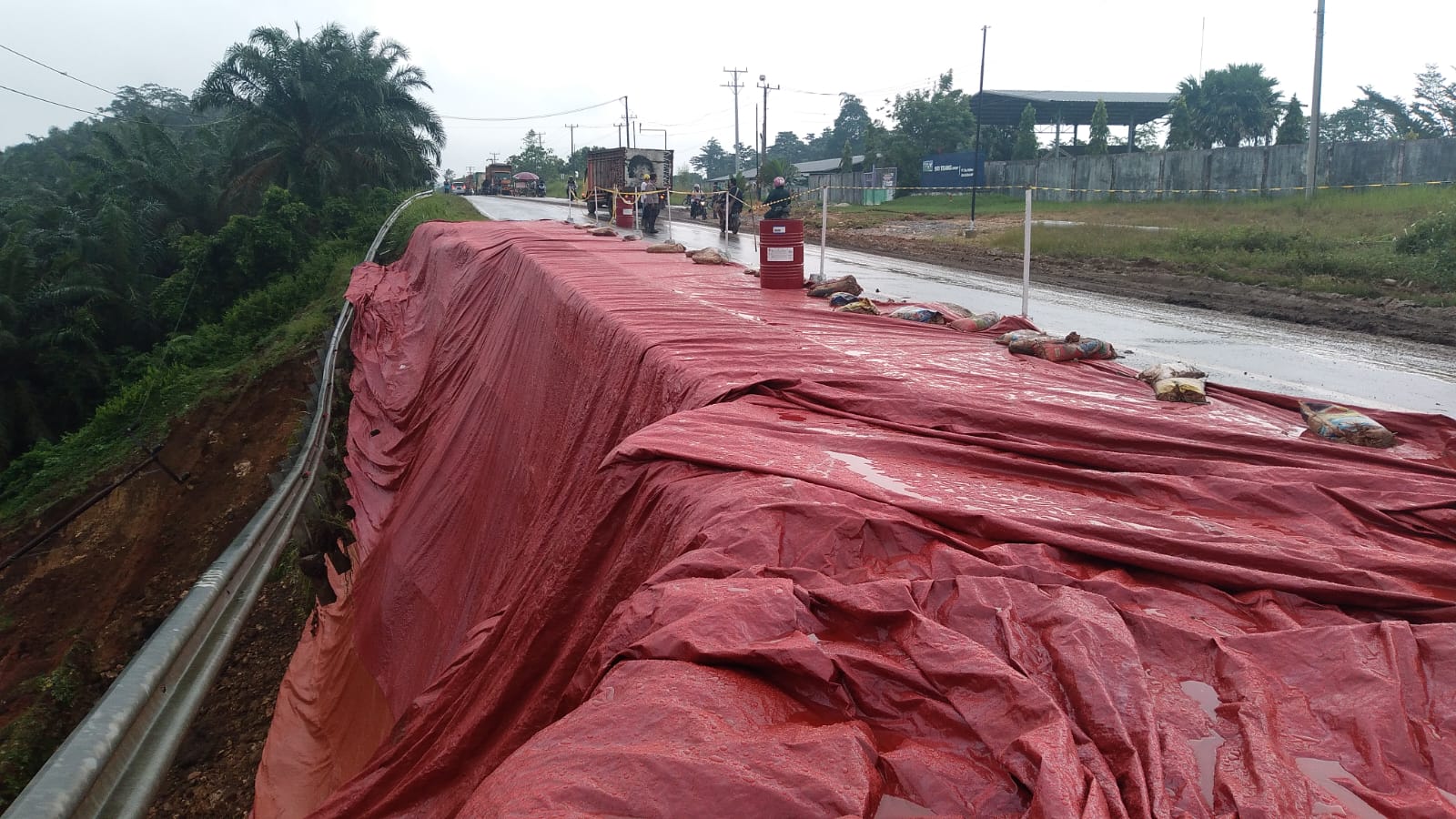 Untuk mengantisifasi dan meminimalisir air membawa material tanah longsor lebih banyak disaat hujan pihak PUPR memasang tarpal pada lokasi tebing jalan yang longsor