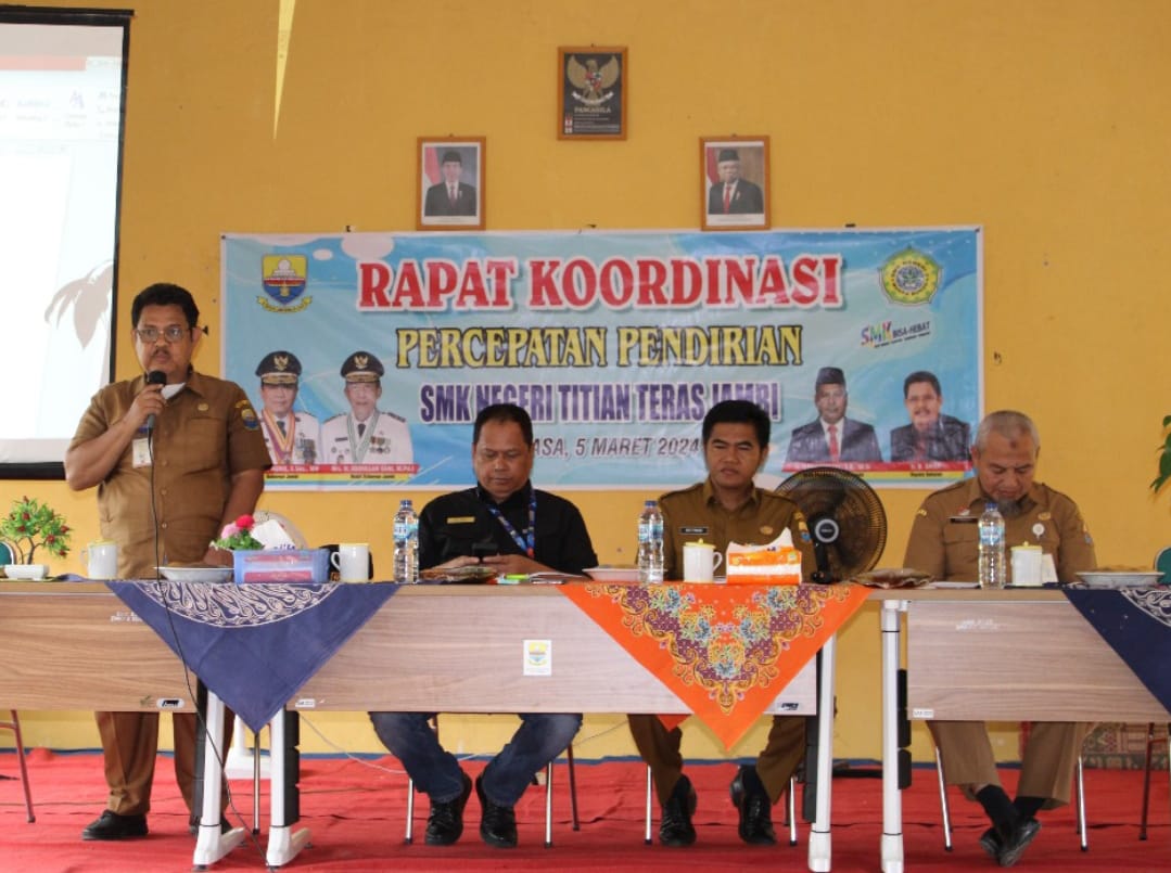 Usai meninjau gedung,asrama dan sarana prasarana lainnya, Kadis Pendidikan Prpvinsi Jambi, H.Syamsurizal,SE.M.Si bersama Kasubag keuangan dan aset didampingi pengawas SMK dan Kepsek SMAN 2 Bungo dan majlis guru menggelar rapat Koordinasi Percepatan pendirian SMK Titian Teras yang digelar di Aula SMKN 2 Bungo ( Bn-war)