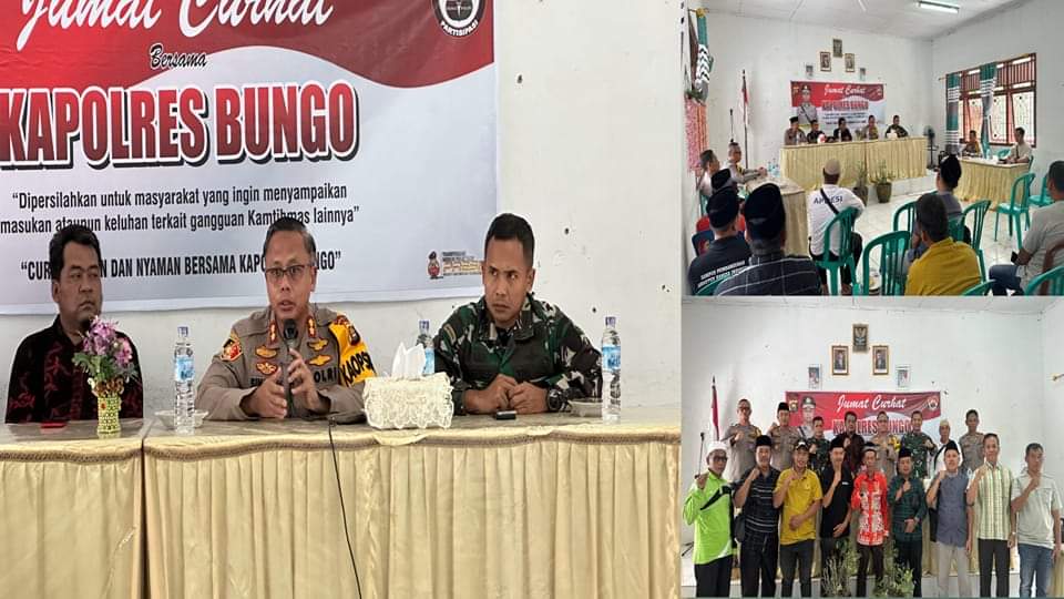 Bungonews.net, BUNGO – Kapolres Bungo bersama Dandim 0416 Bute menggelar Jum,at curhat di kecamatan Bathin III Ulu kabupaten Bungo , bertempat di Kantor camat Bathin III Ulu ,Jum,at (10/05/2024)