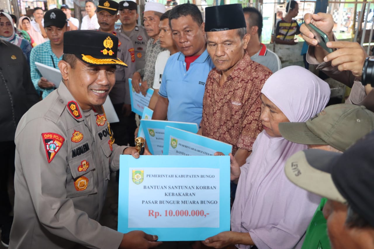 Bungonews.net, BUNGO – Kepala Kepolisian Resort (Polres) Bungo, Polda Jambi, Ajun Komisaris Besar Polisi Natalena Eko Cahyono, Kamis (17/10), bersama Bupati Bungo Mashuri, menyambangi sekaligus membagikan bantuan kepada para korban kebakaran di Pasar Bungur, Kecamatan Pasar Muara Bungo.