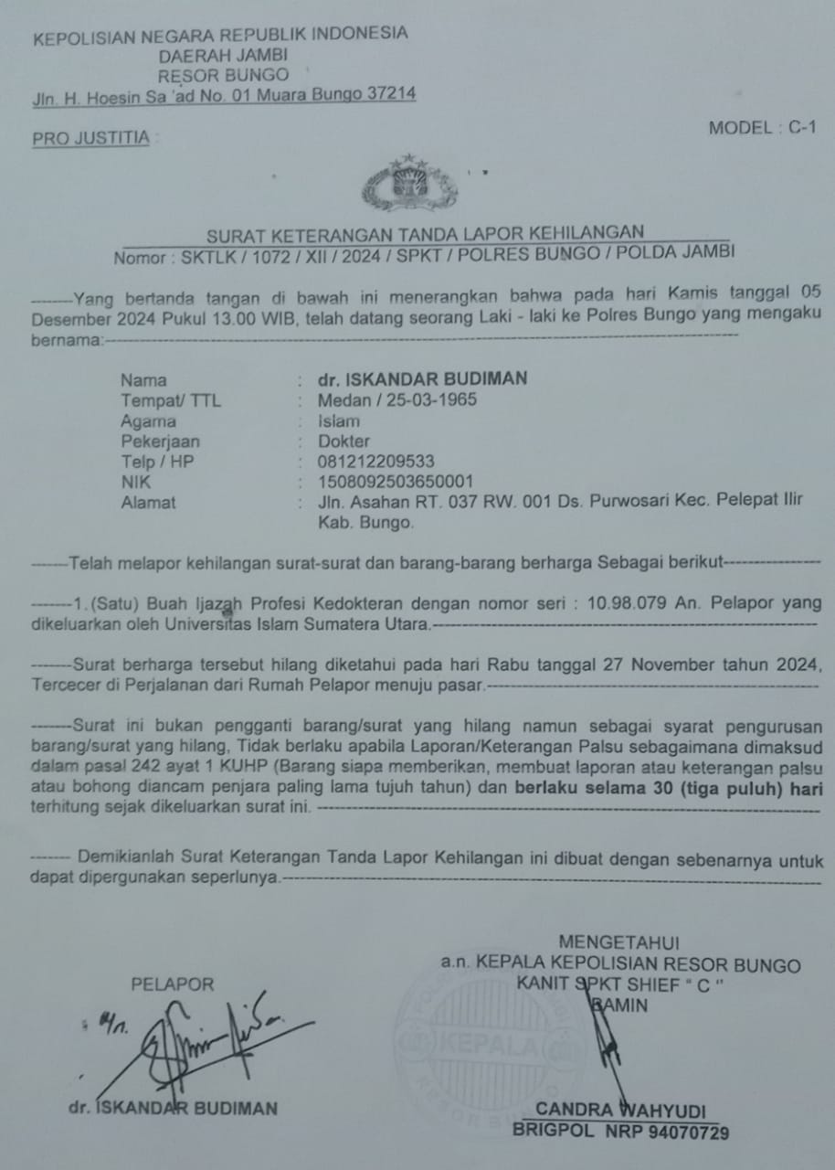 dengan surat keterangan tanda lapor kehilangan nomor : SKTLK/1072/ XII/2024/ SPKT/POLRES BUNGO /POLDA JAMBI