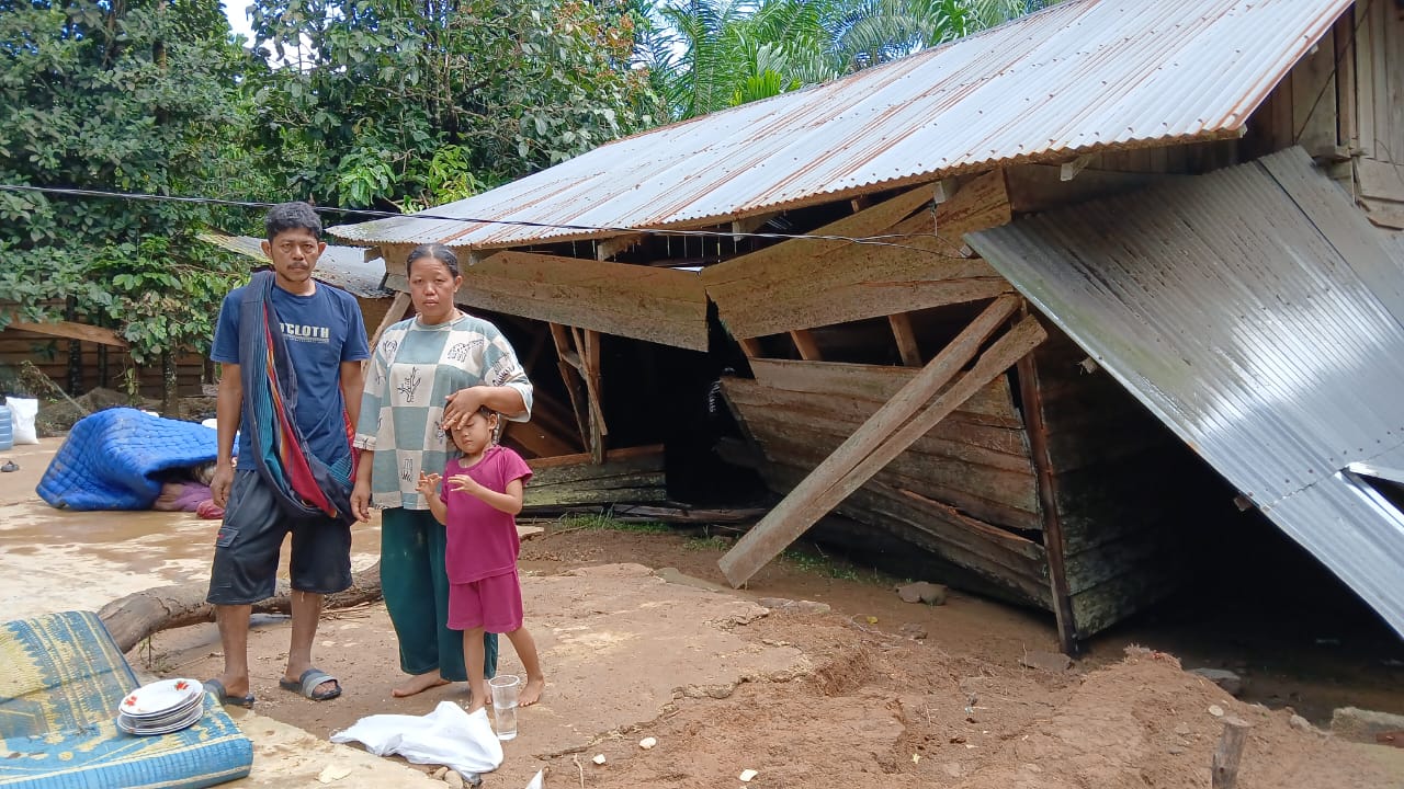” Usai berbuka puasa tiba- tiba air kedalam rumah ,kami sekeluarga di evakuasi oleh warga dengan menggunakan tali ,tidak satupun barang yang bisa kami selamatkan dari rendaman banjir ,bahkan rumah kami pun roboh diterjang banjir ” tutur Sari Bani