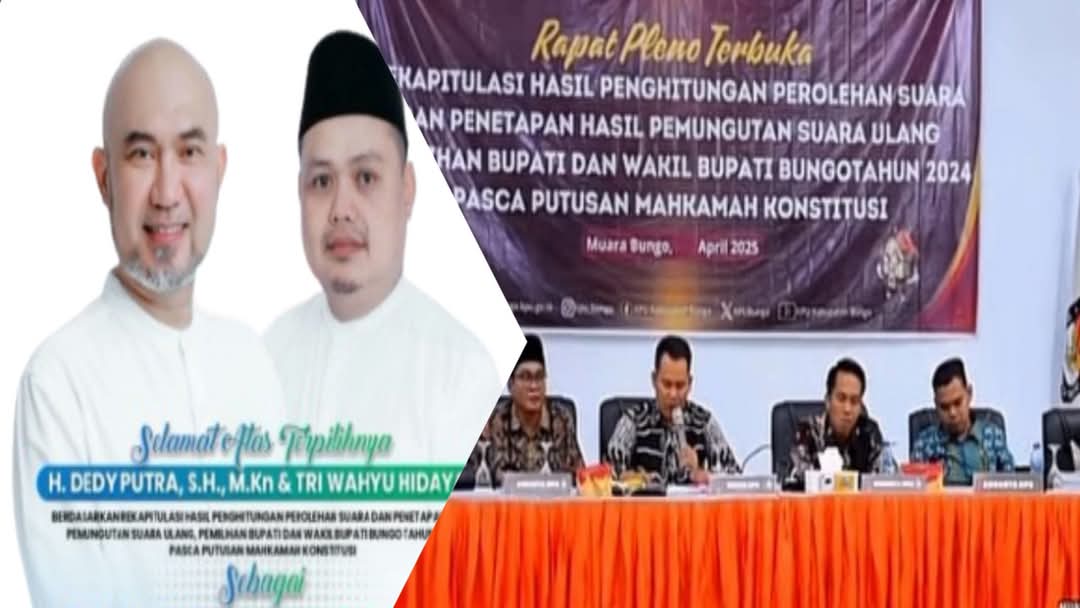 Diketahui hasil rekapitulasi KPU Bungo pada PSU 21 TPS di 8 kecamatan berdasarkan putusan MK 173/PHPU_Bup-XIII dari 17 kecamatan bupati dan wakil Bupati Bungo pada, Senin (7/4/2025). Paslon nomor urut 01 Dedy- Dayat meraih suara 95.845 dan Paslon nomor urut 02 Jumiwan-Maidani meriah suara 95.625.