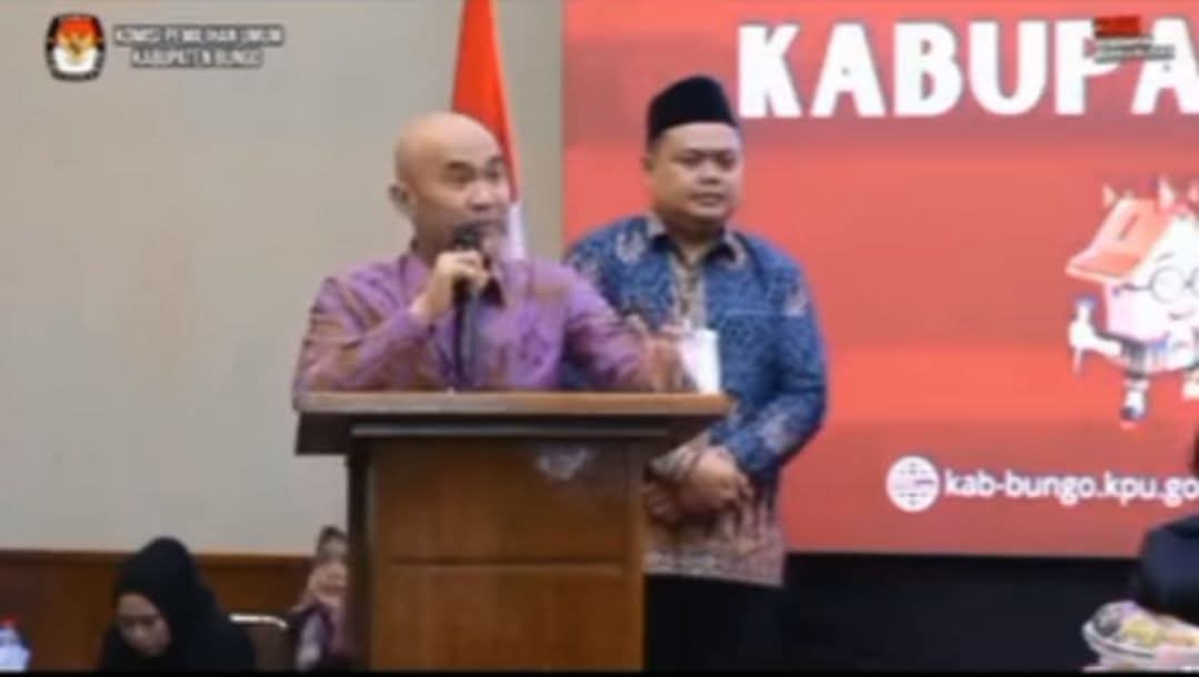 Bungonews.net, BUNGO- ” Masyarakat Bungo Butuh kita kerja Cepat karena banyak yang harus dikerjakan dan dibenahi, untuk itu diperlukan dukungan dan kerjasama semua  pihak dan elemen ,tidak ada lagi 01 dan 02 yang ada masyarakat Bungo bersatu meuju  Bungo Baru ” Ucap Dedy Putra Bupati Bungo terpilih  didampingi wakilnya Tri Wahyudi Hidayat saat menyampaikan pidato perdananya usai pleno penetapan calon bupati dan wakil bupati Bungo hari ini ,Jum,at ( 25/04/2025 ) ballroom hotel Amaris Muara Bungo