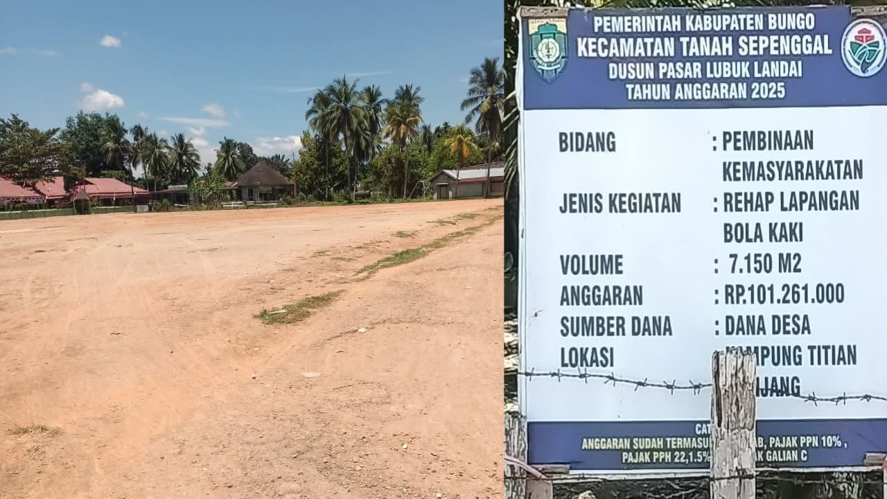 Bungonews.net, Bungo – Proyek rehab lapangan bola kaki senilai Rp.101 juta yang bersumber dari dana desa ( DD ) dusun Lubuk Landai tahun 2025 tidak hanya menyebabkan banjir karena menutup drainase jalan  namun juga diduga tidak sesuai RAB