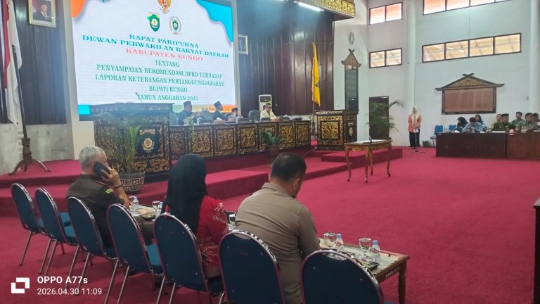 bungonews.net, Bungo-Dewan Perwakilan Rakyat Daerah (DPRD) Kabupaten Bungo menggelar Rapat Paripurna pada Kamis (30/4/2026) di Gedung DPRD Kabupaten Bungo. Rapat yang dimulai sekitar pukul 10.35 WIB ini mengusung agenda koordinasi serta penyampaian laporan partai sebagai bagian dari rangkaian pembahasan Laporan Keterangan Pertanggungjawaban (LKPJ) Tahun Anggaran 2025.